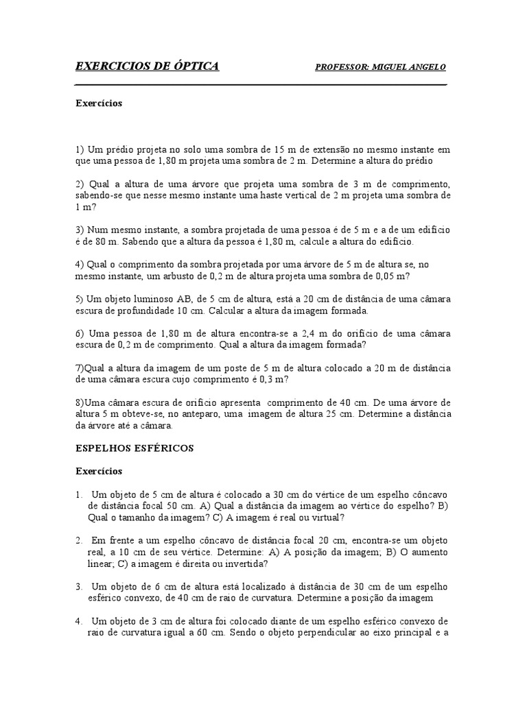 Lista de Exercícios de Física - Óptica Espelhos Esféricos. Prof. Gustavo Dúvidas : ou - PDF Download grátis